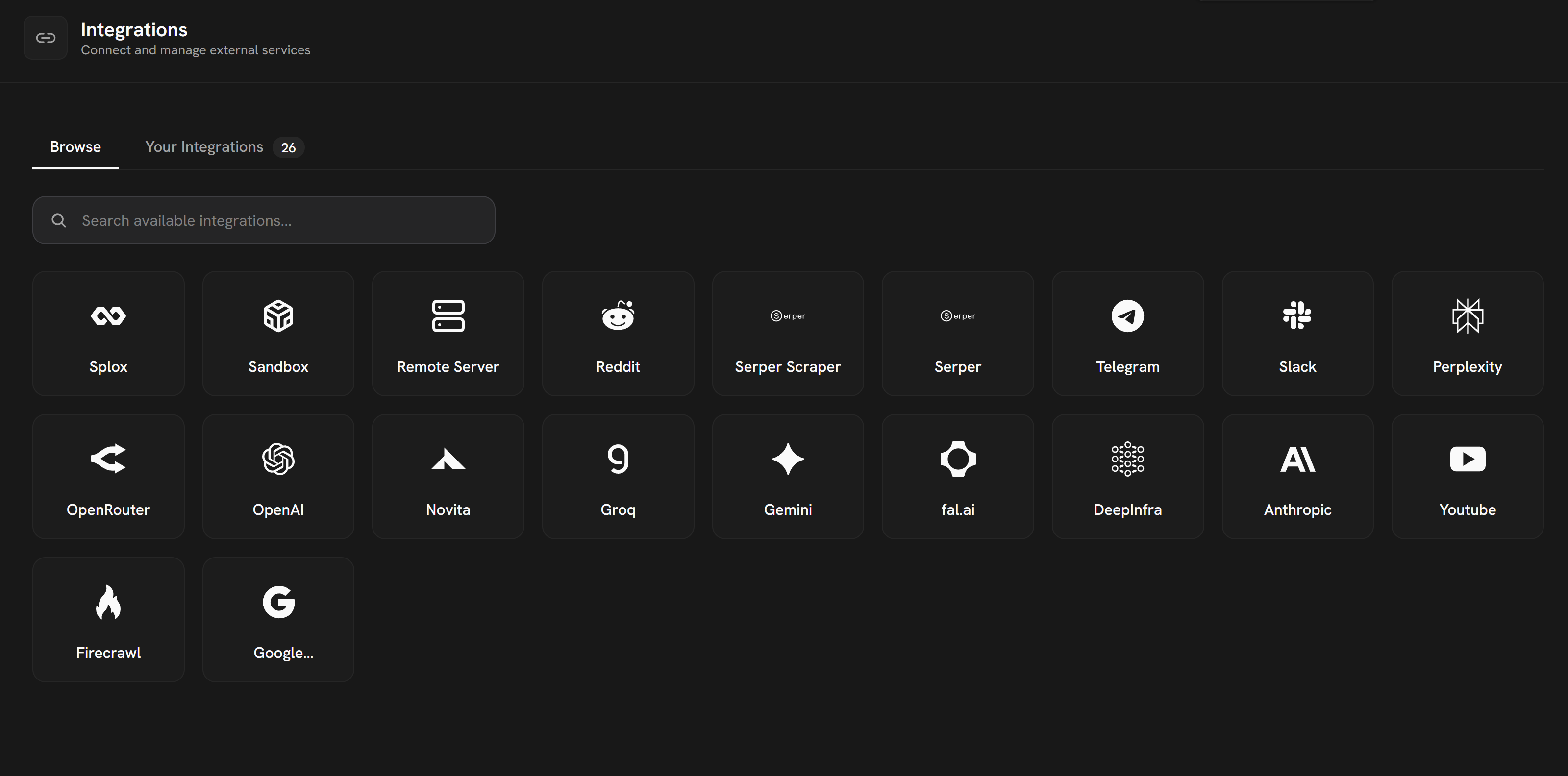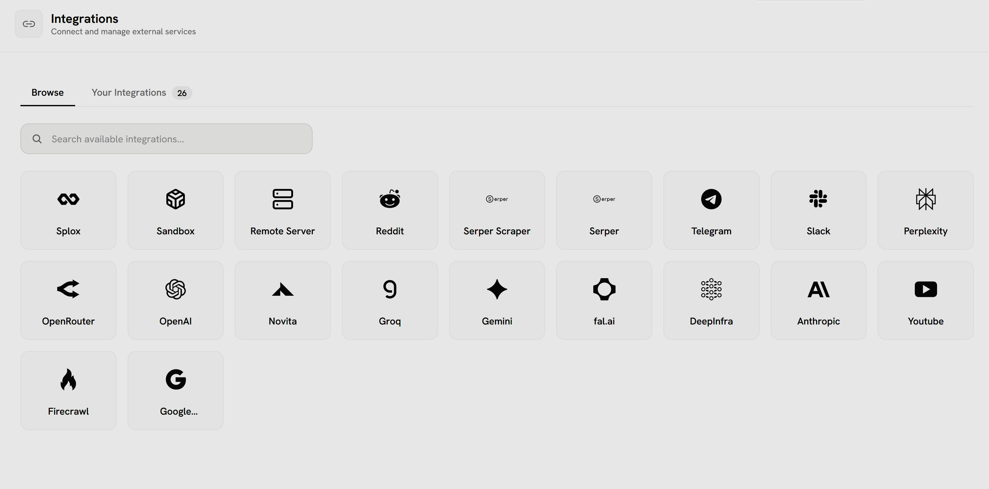 Unlike typical integrations that connect to external services, Sandboxes provide persistent code execution environments.While sandboxes appear in the integrations browse list and are accessed through the integrations system, they work fundamentally differently from API-based integrations. They’re important enough to have their own Core Concept page.