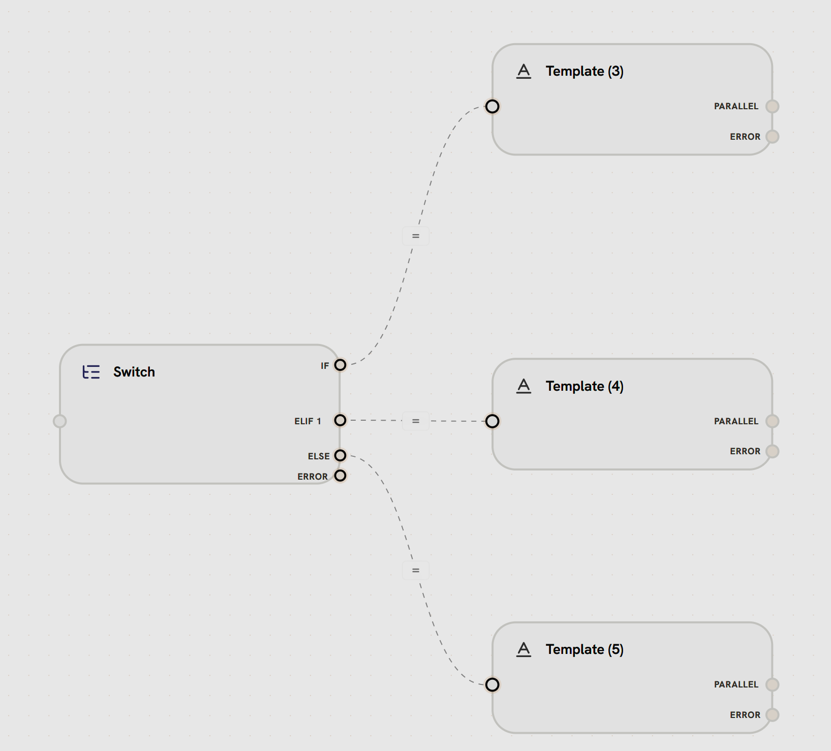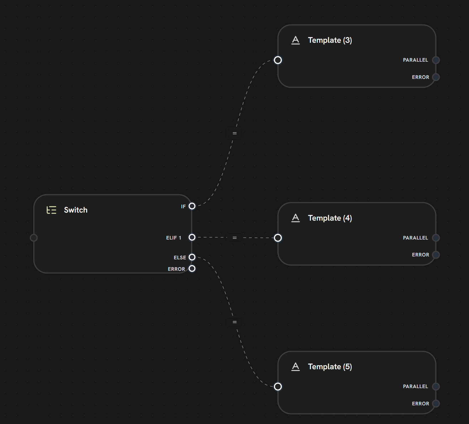 - Switch Node has 4 output handles: IF, ELIF 1, ELSE, ERROR