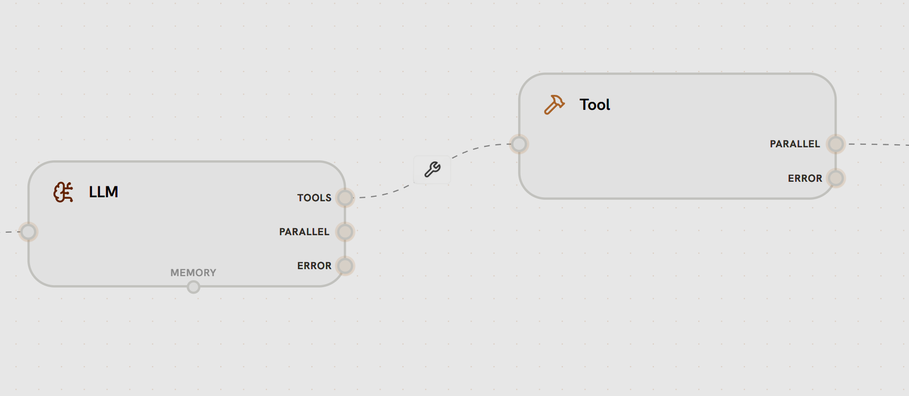 Purpose: Connect LLM nodes to tool nodes for AI tool calling Tool edges are special connections that make tools available to LLM nodes. When an LLM is connected to tool nodes via tool edges, those tools become part of the LLM’s available function set.