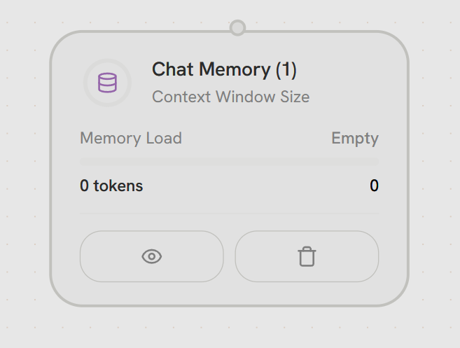 Memory nodes use a special bidirectional connection to the LLM’s MEMORY handle. They don’t have traditional PARALLEL or ERROR output handles - the memory connection handles all data flow.