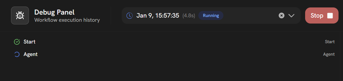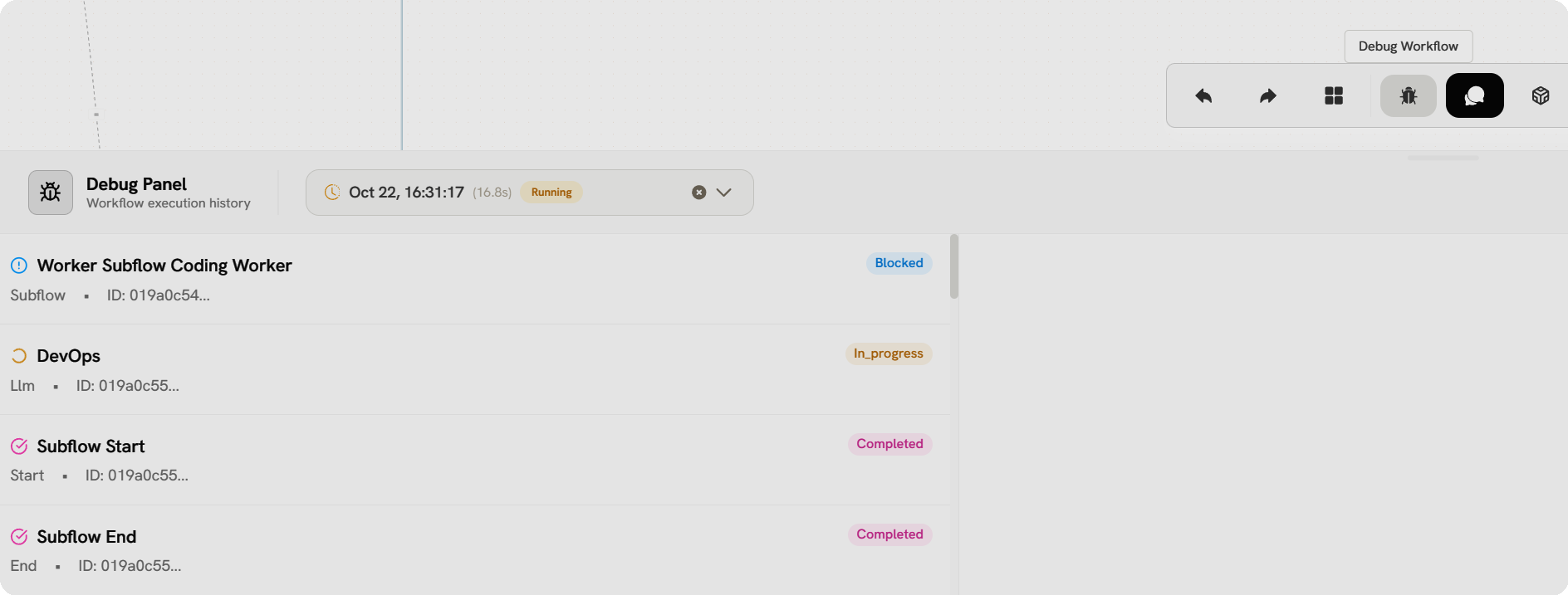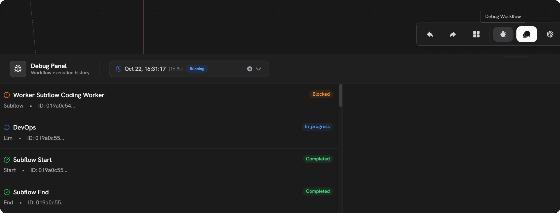 Watch your workflow run in real-time. The Debug Panel shows node-by-node progress with status indicators (Running, Completed, Blocked).Location: Debug Panel (sidebar during execution)