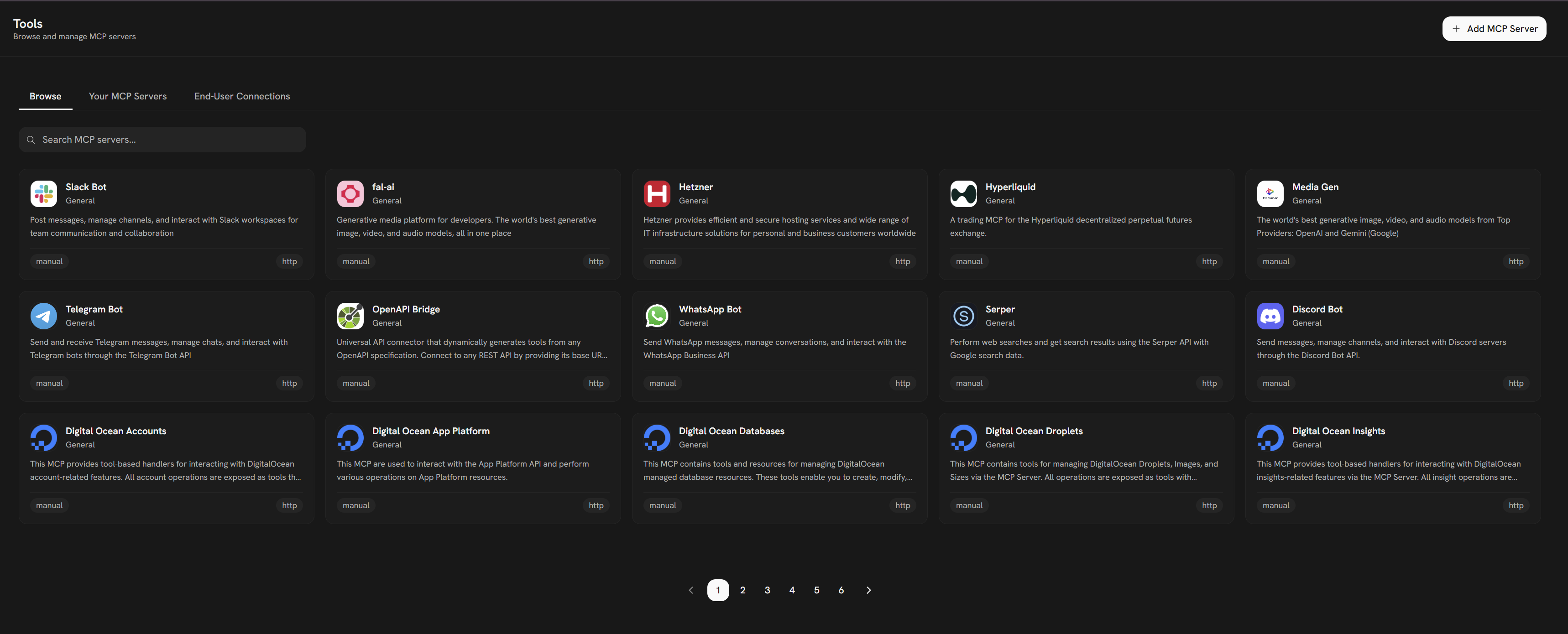 - Browse or search for the service you want to connect (e.g. Telegram, Slack, Serper)