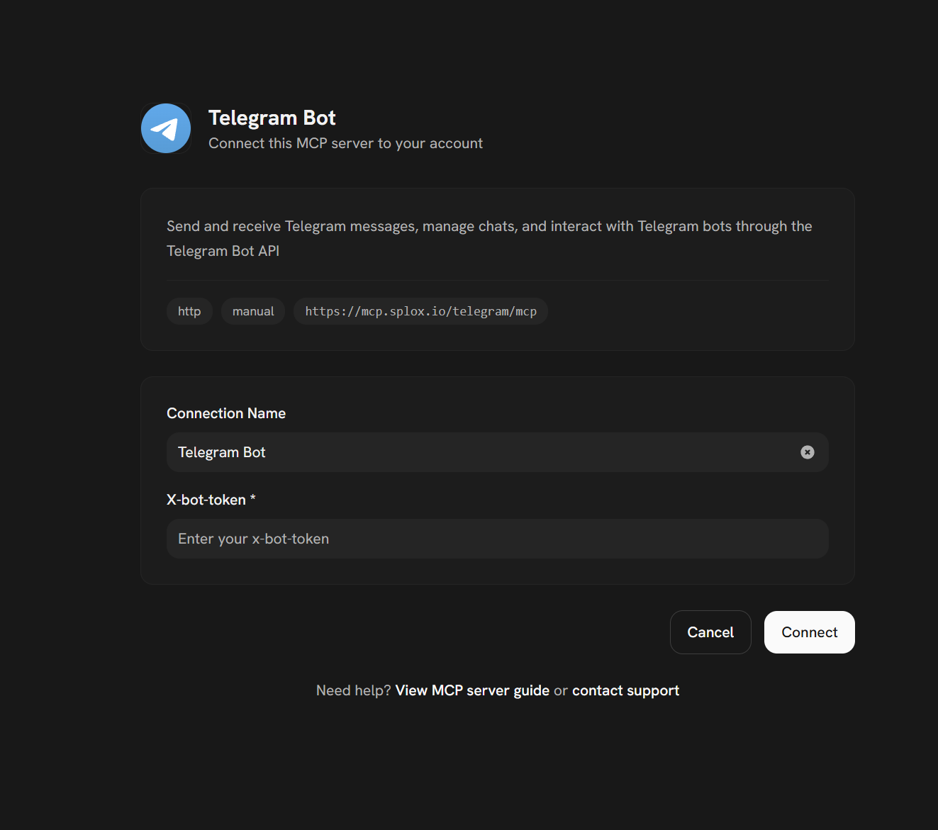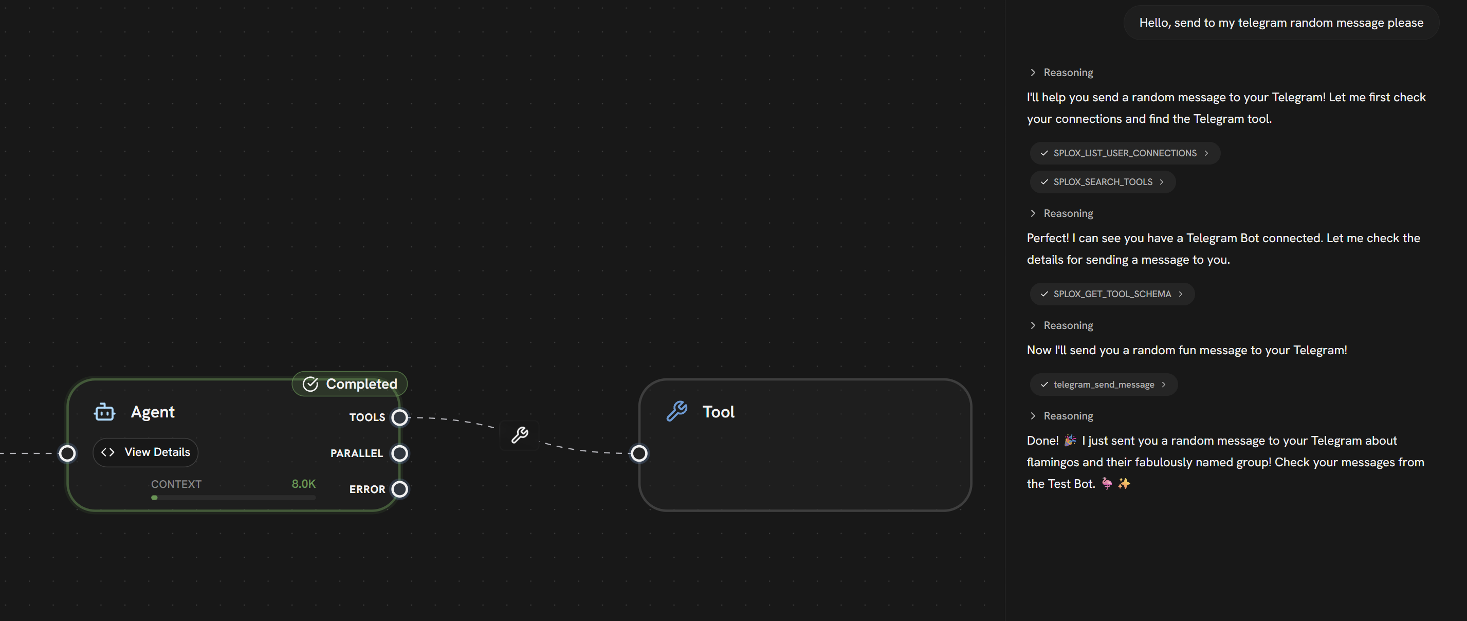 MCP (Model Context Protocol) is an open standard that defines how AI agents communicate with external tools and services. Think of it as a universal adapter — any service that speaks MCP can be plugged into any MCP-compatible agent. In Splox, every external integration (Telegram, Slack, GitHub, databases, custom APIs) is an MCP server. When you connect one, your agent gains the ability to call its tools — send messages, query data, trigger actions — all through a single standardized interface.You don’t need to understand the MCP protocol itself. Splox handles everything — you just connect and use.