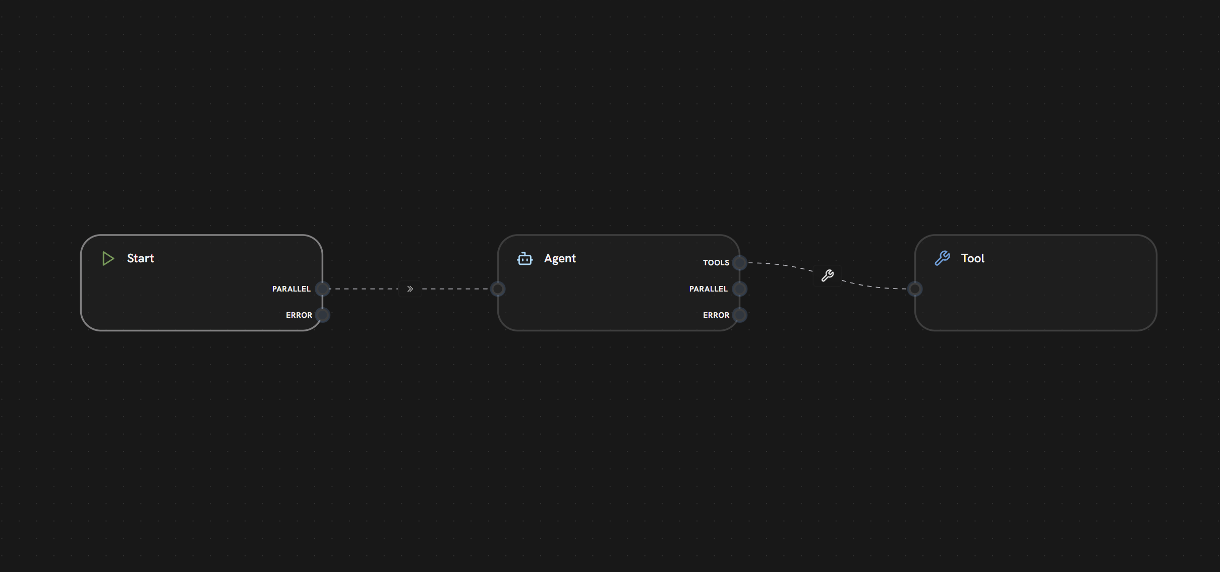 The TOOLS handle is used for tool-calling loops — results return to the Agent. The PARALLEL handle is for regular sequential flow where the Agent’s output passes to the next node without looping back.