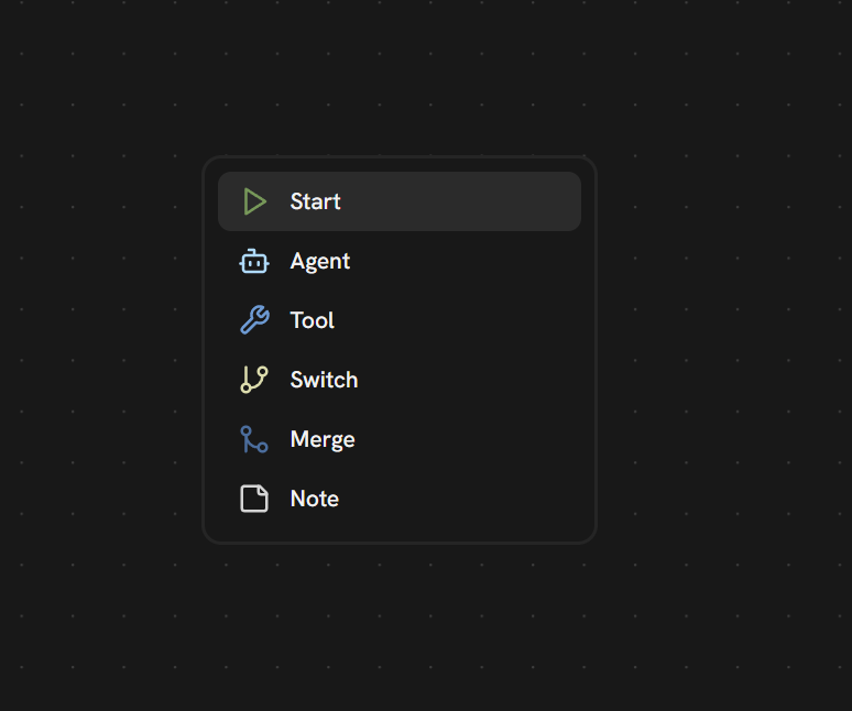 The Start node is the entry point of your workflow.- Right-click on the canvas → Start
