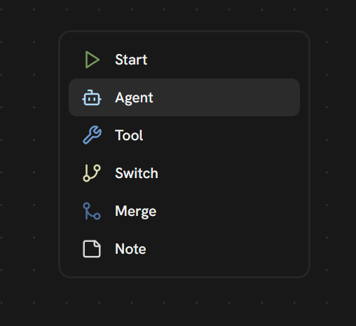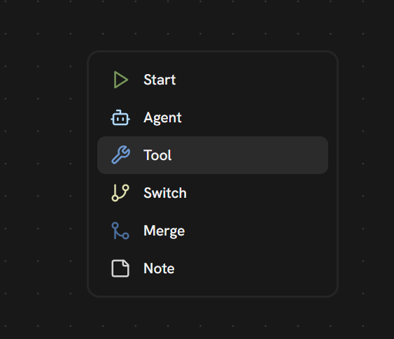 The Agent node is an LLM that reads the input, reasons about it, and decides whether to call a tool or respond directly.- Right-click on the canvas → Agent