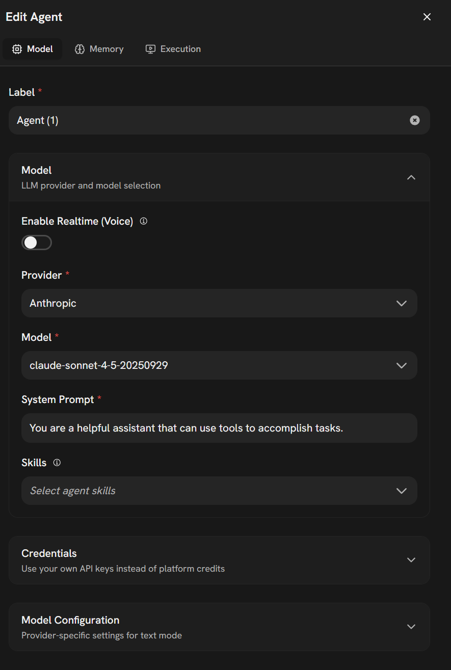 | Credentials | Use your own API keys instead of platform credits |